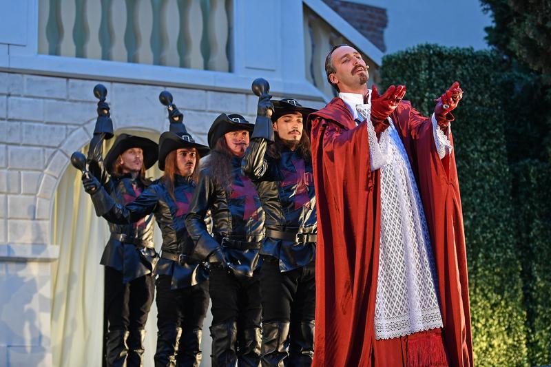 Čtyři nerozlučné přátele z počátku 17. století zná celý kulturní svět. Mladý, radostný a statečný d´Artagnan, rozumný, tajemný a srdečný Athos, chvástavý, bodrý a silný Porthos a zbožný, subtilní a hloubavý Aramis se znovu a znovu v nových zpracováních vydávají na strastiplnou cestu, aby zabránili nekalým plánům intrikána par excellence - kardinála Richelieu. Nesmrtelný příběh největšího romantického prozaika a dramatika Alexandra Dumase znají čtenáři již od roku 1844 a od té doby se objevil v dlouhé řadě filmových i divadelních zpracováních. Také naši diváci se s ním před časem seznámili v úspěšné adaptaci režisérky Hany Burešové. Nyní se ovšem vrátí v jiné, veršované verzi Vítězslava Nezvala, která pro prostředí Biskupského dvora ideálně zdůrazňuje romantické a historické linie známého příběhu. Čtyřiatřicetiletý básník vytvořil dramatizaci v roce 1934 na zadání dramaturgie Vinohradského divadla, od té doby se hrála mimo jiné v roce 1953 v Karlínském divadle v režii Václava Kašlíka a v roce 1982 byla v režii Ladislava Rychmana zpracována ve dvoudílný televizní film. Čeká nás tedy znovu setkání se zamilovanou královnou a vévodou z Buckinghamu, kterým se na povel kardinála snaží škodit hrabě Rochefort a záhadná Mylady de Winter, nebude chybět ani přátelský sluha Planchet a krásná Constance Bonacieux. Strhující cesta za diamantovými přívěsky nabízí ideální divadelní zážitek před začátkem léta. Pod širým nebem tak budou diváci moci v nové verzi sledovat známý příběh plný lásky, intrik, statečnosti a především přátelství v režii Igora Ondříčka, který pro tento prostor již zdárně připravil inscenaci Noc na Karlštejně.