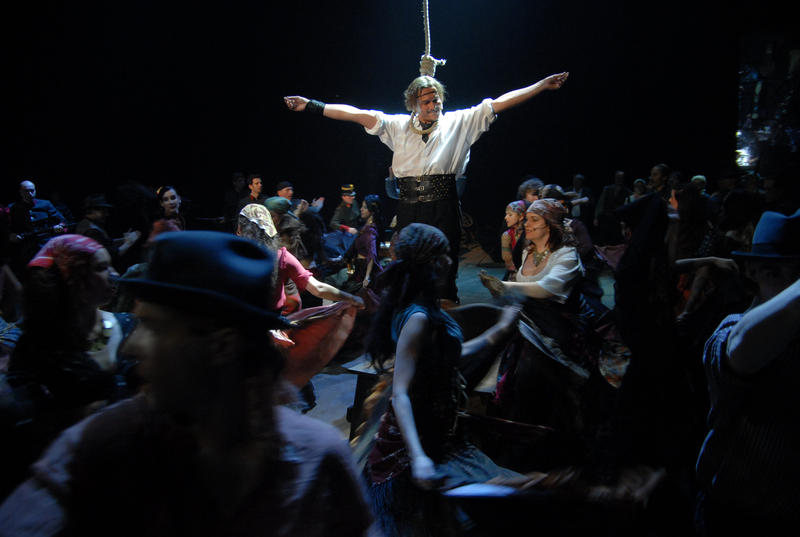Kracikova verze Cikánů patří k inscenacím nejvěrnějším filmovému předobrazu. Překonává ho scénickou monumentálností, rozšířením celku o další písně pro precizní sóla Dušana Vitázka (Aralambi) nebo Jana Apolenáře (Buča).
